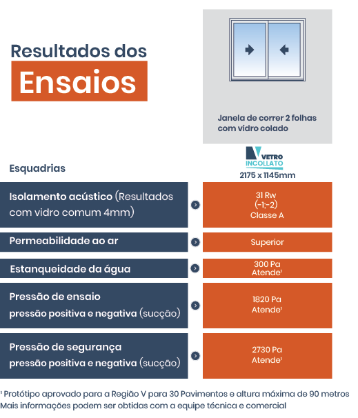 O excelente desempenho da Vetro Incollato foi avaliado e aprovado nos ensaios de estanqueidade à água e ao ar, segundo os requisitos da norma técnica ABNT NBR 10821:2017, com condições aprovadas para atendimento em todas regiões do país, para edificações de até 30 pavimentos ou altura máxima de 90 metros.